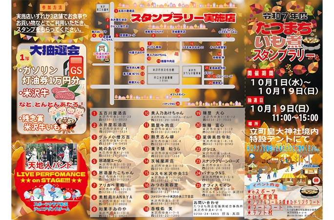 Home お知らせ, イベント たつまちオータムフェスタのお知らせ たつまちオータムフェスタのお知らせ 2025.09.30 お知らせ、イベント 平素は、たつまち商店街をご利用賜り誠にありがとうございます。 恒例となりました「たつまちオータムフェスタ」を今年も開催いたします。 豪華賞品が当たる(ハズレなし)スタンプラリーも始まりますので、下記スタンプラリー用台紙をダウンロードしてご利用ください。 たつまち商店街スタンプラリー台紙 Post Share Hatena Pocket RSS feedly Pin it コメントは利用できません。